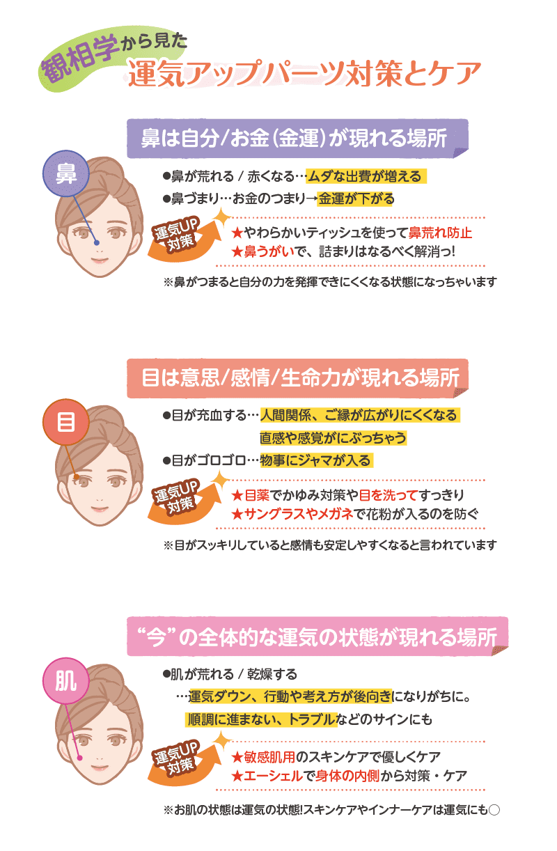「この季節がやってきた」と思う方が多いこの季節。アレルギー症状で、気持ちまで落ちていませんか?花粉症でも”美”と”運気”は保ちたい!ということで、観相学からもおすすめの花粉症対策とケアを、気になるパーツ別にご紹介します。