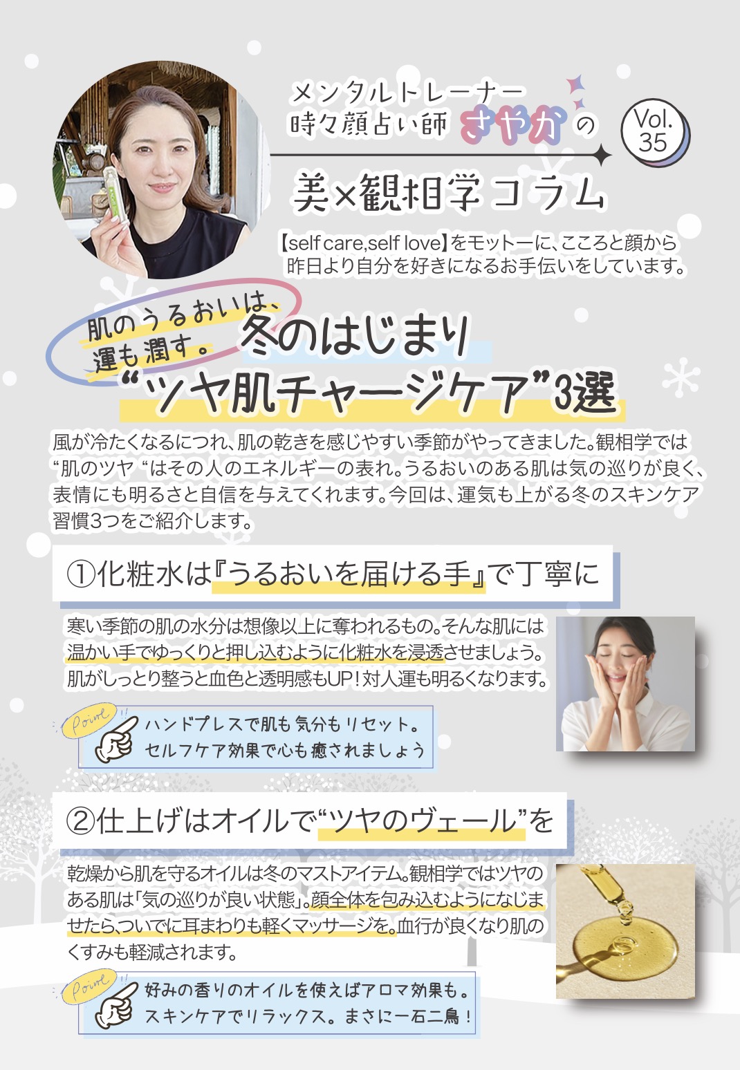 Andyou. Blog 美×観相学コラム【Vol.35】 冬のはじまり-ツヤ肌チャージケア3選- 2025.12.26 美×観相学コラム【Vol.34】運気が上がる-まつ毛の作り方- 前の記事 美×観相学コラム【Vol.36】 福相でスタートする-キレイ開き- 次の記事