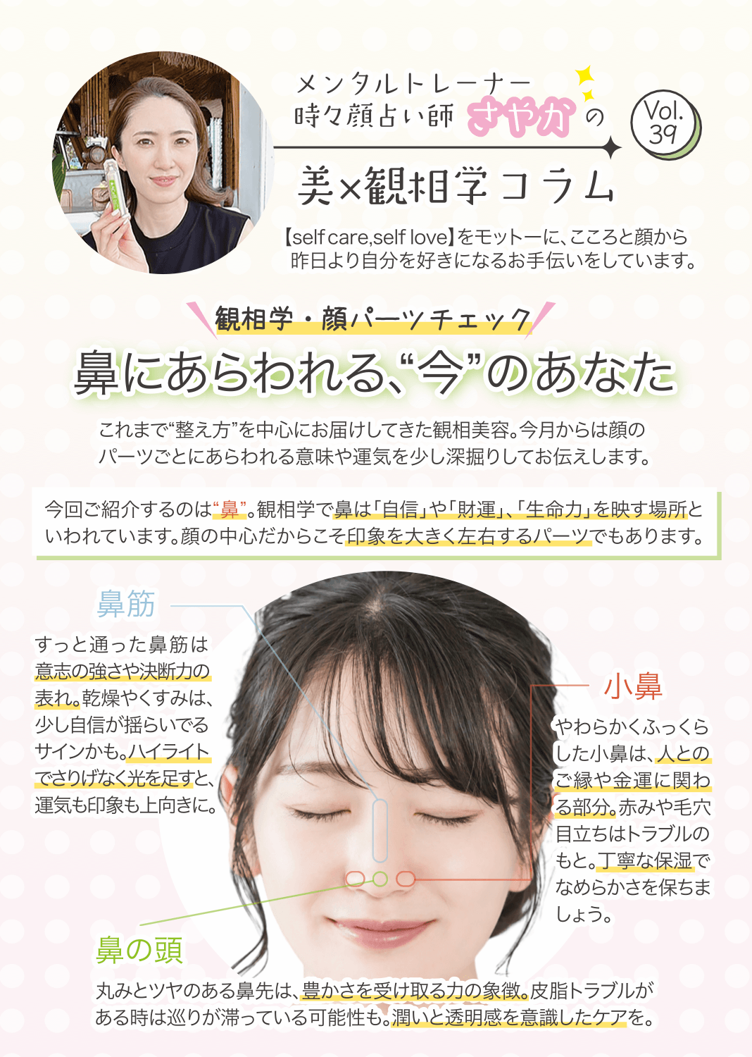 Andyou. Blog 美×観相学コラム【Vol.39】観相学・顔パーツチェック-鼻にあらわれる“今”のあなた- 2026.03.25 美×観相学コラム【Vol.38】前髪・ツヤ・明るさ-運を迎える“赤ちゃんおでこ”のつくり方- 前の記事